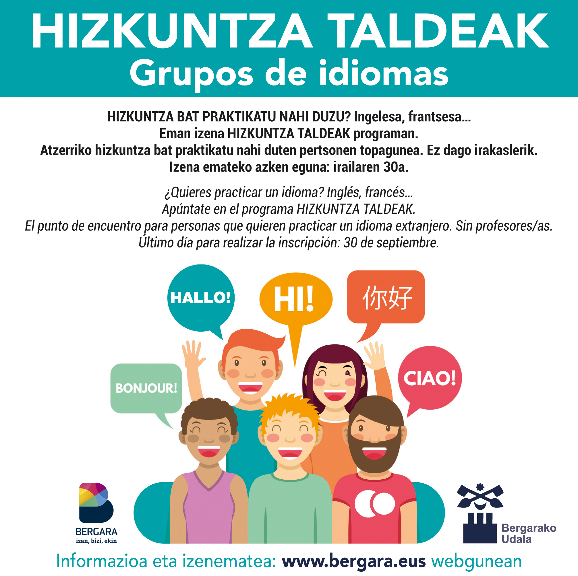El Ayuntamiento de Bergara pondrá en marcha grupos de idiomas con el objetivo de facilitar el proceso de aprendizaje a las y los ciudadanos que estén aprendiendo idiomas. A través de esta iniciativa, las y los alumnos tendrán la oportunidad de poner en práctica el idioma que están aprendiendo de forma sencilla e informal.