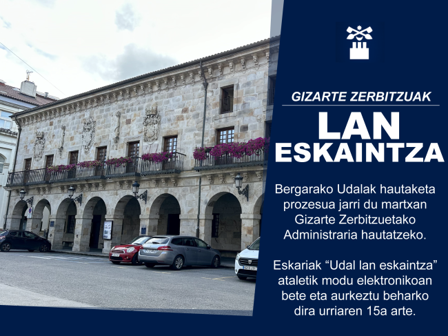 El Ayuntamiento de Bergara ha puesto en marcha un proceso de selección para elegir a un administrativo de Servicios Sociales.