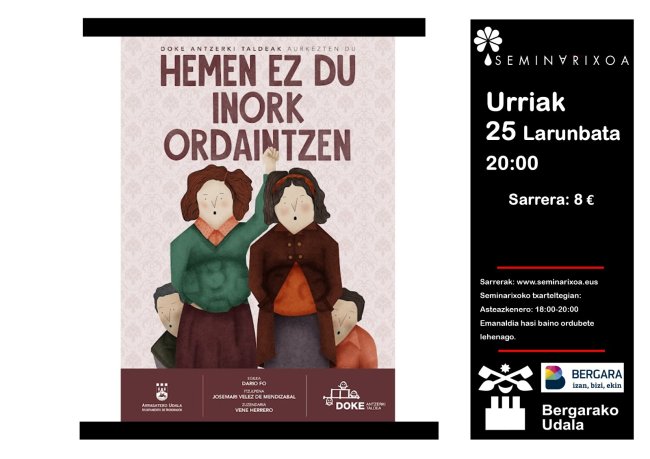 Esta iniciativa comenzará con la obra “Hemen ez du ordaindu”, presentada por Doke Antzerki Taldea. La actuación tendrá lugar el sábado 25 de octubre a las 20:00 horas en el Seminario, y la entrada cuesta 8 euros. Para adquirir las entradas: www.seminarixoa.eus o en la taquilla del Seminario (miércoles, 18:00-20: 00). La sesión de accesibilidad se adaptará una hora antes del inicio de la función.