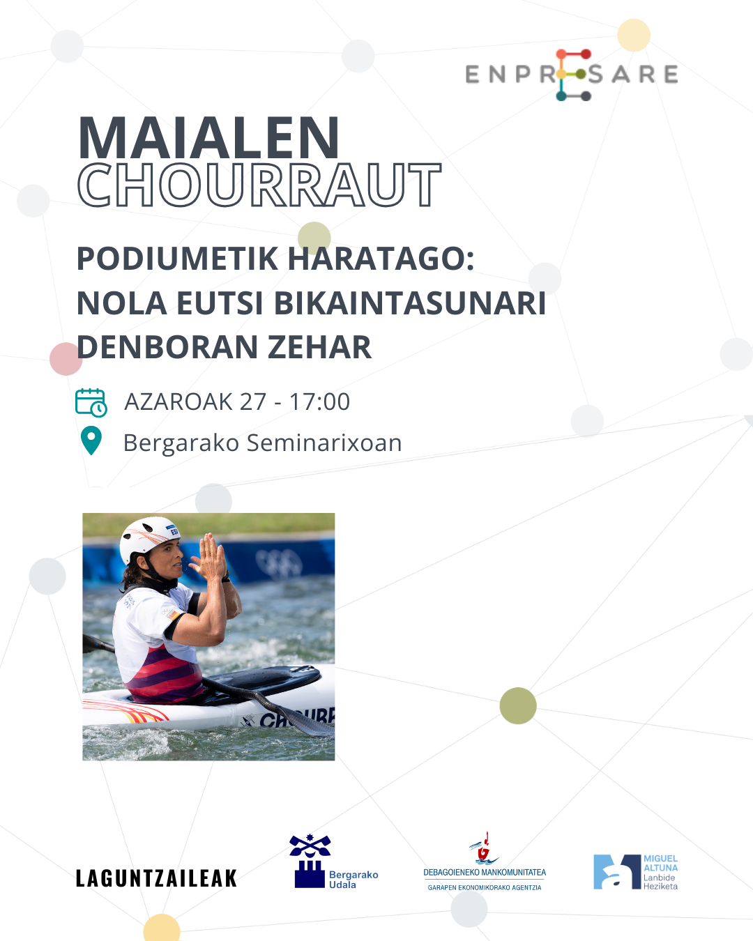 Maialen Chourraut, campeona olímpica, compartirá su experiencia en Bergara el próximo jueves 27 de noviembre a las 17:00 horas en el Seminario. Desde los primeros temores al agua hasta la cumbre deportiva mundial, su trayectoria demuestra que la excelencia no es el único destino, sino el resultado del trabajo constante, el aprendizaje y los valores.