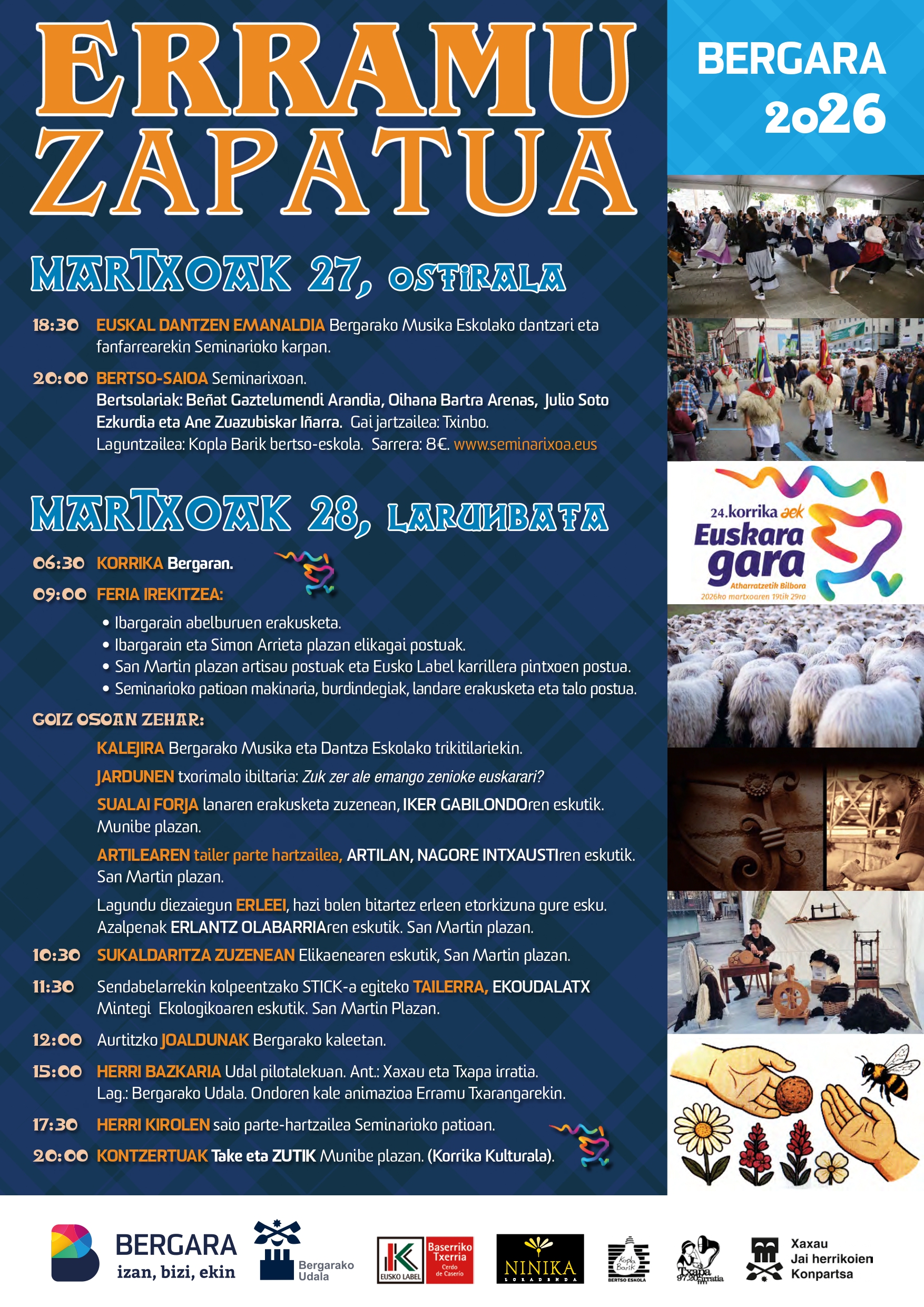 Sin embargo, desde la víspera, habrá cosas que ver y hacer. Además de la actuación de euskal dantzak de la tarde, el viernes 27 de marzo, las y los aficionados a la bertsolaritza tendrán una cita a las 20:00 horas en el Seminarixo, con las y los bertsolaris Beñat Gaztelumendi, Oihana Bartra, Julio Soto y Ane Zuazubiskar. El ponente será Txinbo, y le acompañará la escuela de bertsos Kopla Barik. Entrada: 8 euros, disponible en www.seminarixoa.eus.