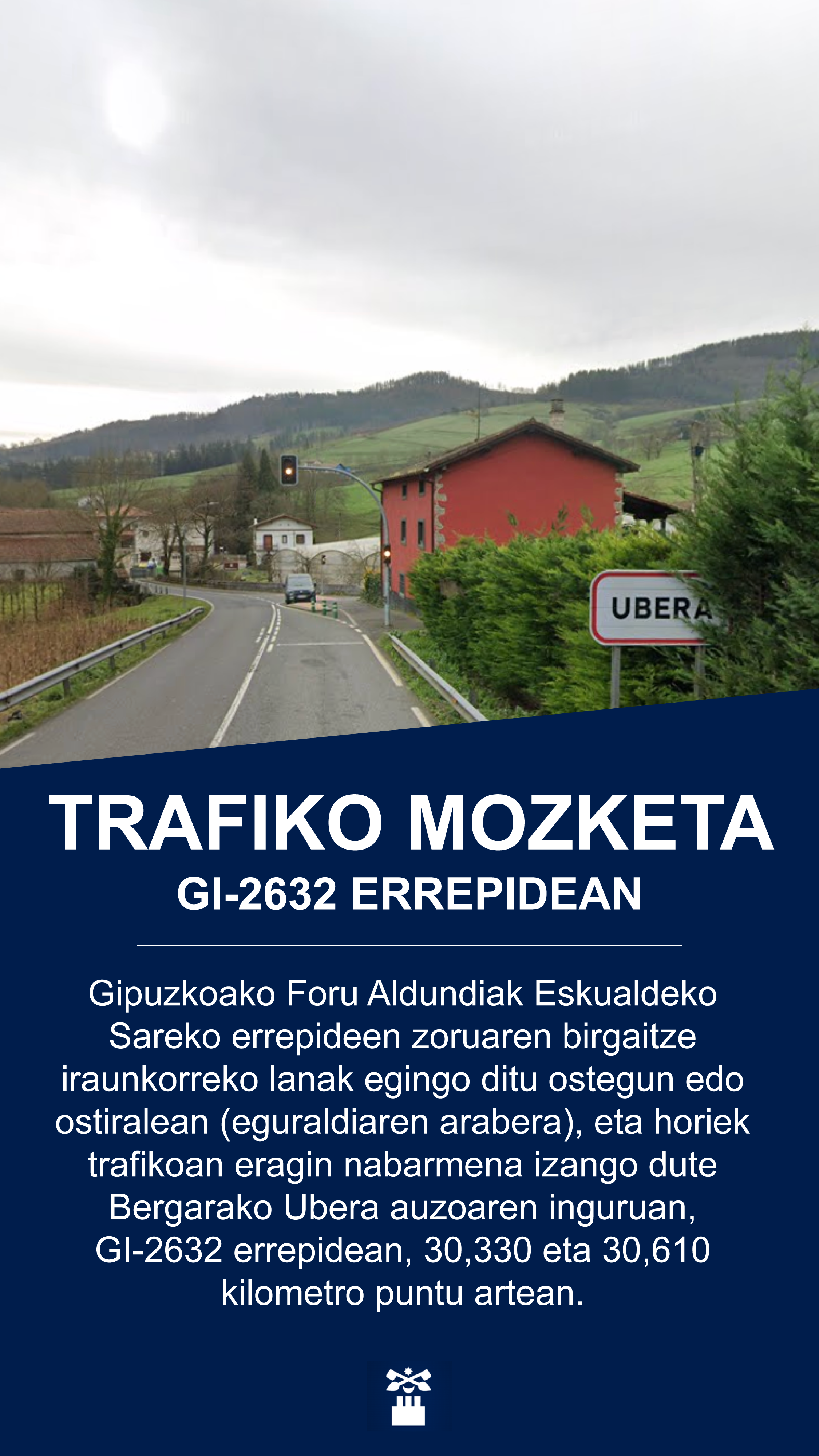 • El cierre afectará a parte de la travesía del barrio de Ubera: desde el caserío Errementarikoa (c.p. 30,330) hasta el cambio de dirección tras el paso del caserío Bidebitarte (c.p. 30,610).