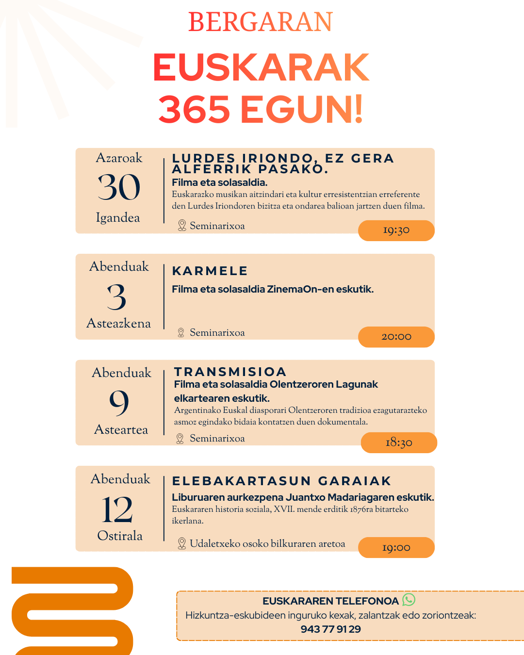 Bergarako Udalak abenduaren 3an ospatuko den Euskararen Egunerako ekimen bereziak antolatu ditu. Azaroaren amaieratik abenduaren erdialdera bitartean, herritarrek aukera izango dute filmez, solasaldiez eta liburu aurkezpenez gozatzeko, euskararen inguruko gogoeta eta esperientziak partekatuz.