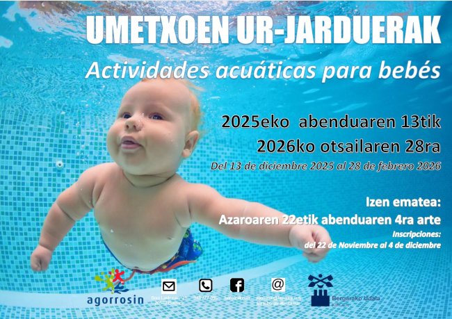 Bergarako Udalak antolatutako umetxoentzako ur jarduerak abian jarriko dira berriro, 2025eko abenduaren 13tik 2026ko otsailaren 28ra bitartean. Jarduera hauek gurasoen laguntzarekin egiten dira, uraren onurak aprobetxatuz haurren garapen motorra sustatzeko eta guraso-haur arteko lotura indartzeko. Helburua da gurasoei ur ingurunean autonomia ematea eta jardueraz gozatzeko aukera eskaintzea, baita haurren garapen motorra bultzatzea ere.