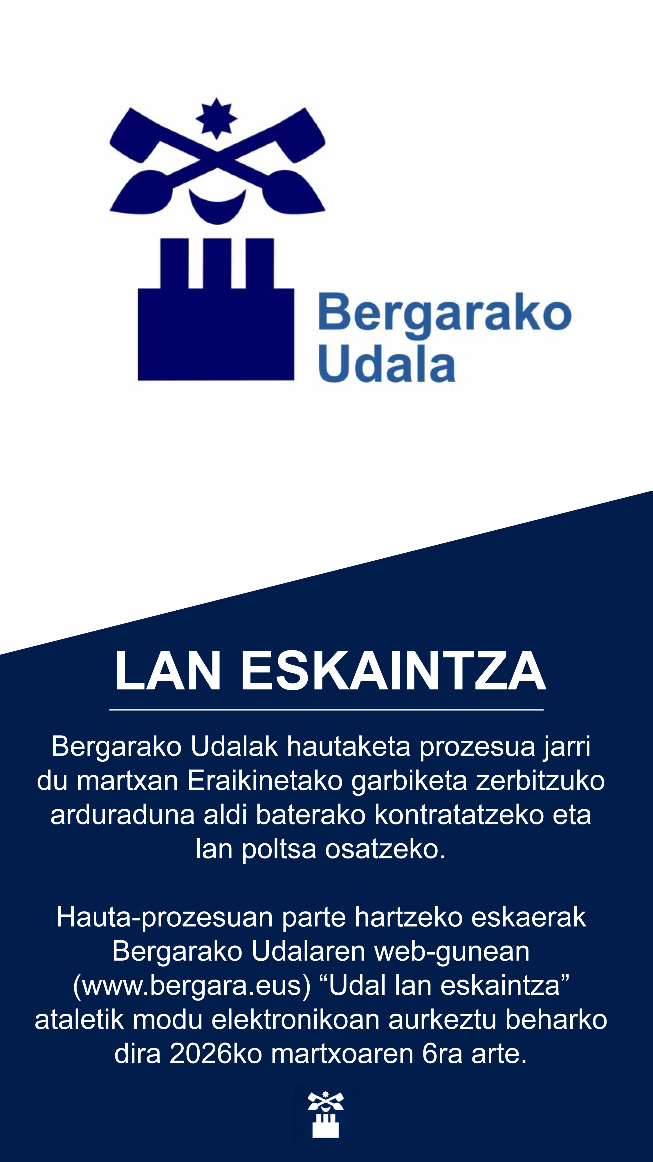 Bergarako Udalak hautaketa prozesua jarri du martxan Eraikinetako garbiketa zerbitzuko arduraduna aldi baterako kontratatzeko eta lan poltsa osatzeko.