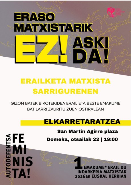 Bestetik, indarkeria matxistaren azken kasu hau salatzeko egingo diren mobilizazioekin bat egiten du eta otsailaren 22an, igande honetan, 19:00etan, San Martin plazan egingo den elkarretaratzean parte hartzeko deia luzatzen die herritarrei.