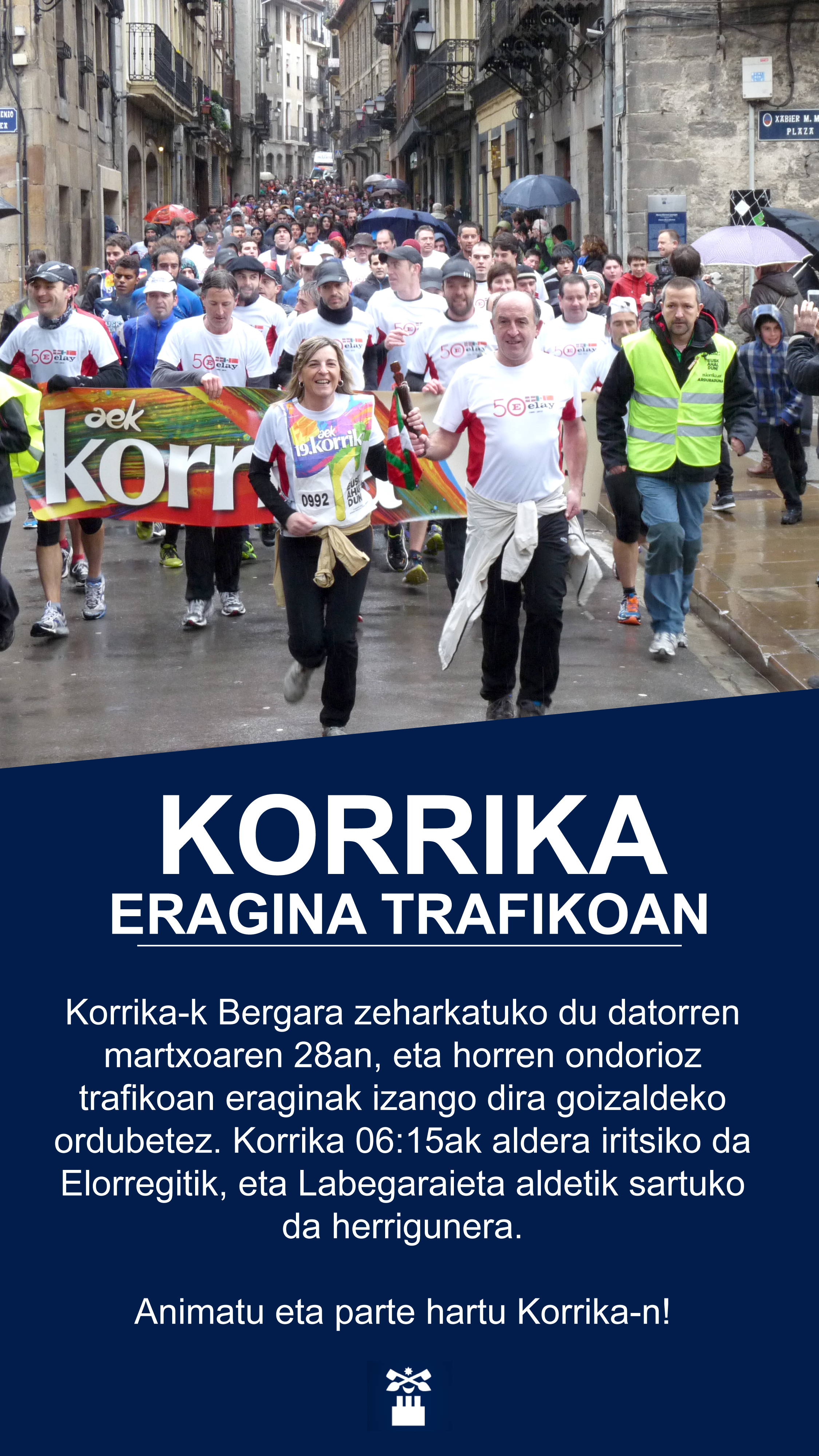 Korrika-k Bergara zeharkatuko du datorren martxoaren 28an, eta horren ondorioz trafikoan eraginak izango dira goizaldean. Korrika 06:15ak aldera iritsiko da Elorregitik, eta Labegaraieta aldetik sartuko da herrigunera.