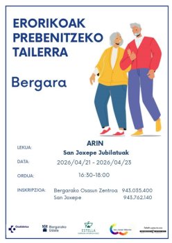 Eguna eta ordua: 04/21/2026 - 16:30Antolatzailea: Bergarako Udala eta OsakidetzaHizkuntza: EuskarazGaztelerazAzalpena: Izena ematea: Bergarako Osasun Zentroa 943 035 400 San Joxepe 943 762 140 Non: San Joxepe jubilatuen elkartea