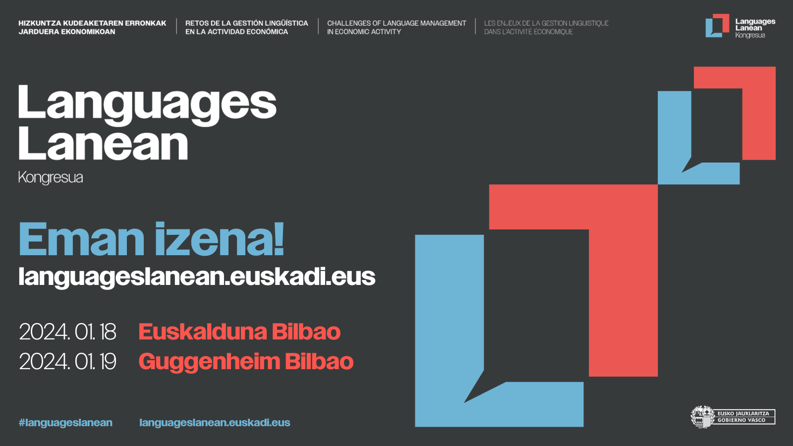 Kongresua doakoa da, baina bertaratzeko beharrezkoa da izena ematea webgunearen bidez: https://languageslanean.euskadi.eus