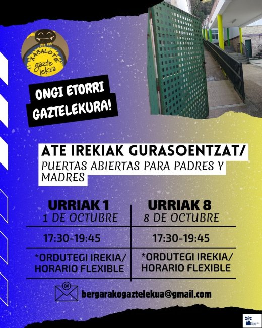 El Gazteleku de Bergara ha organizado puertas abiertas para padres y madres con el fin de ofrecerles la posibilidad de conocer la actividad y el espacio del gazteleku. El objetivo de esta iniciativa es que los padres y madres conozcan de primera mano los recursos, la dinámica y las formas de fomentar la participación de las y los jóvenes que ofrece el gazteleku.