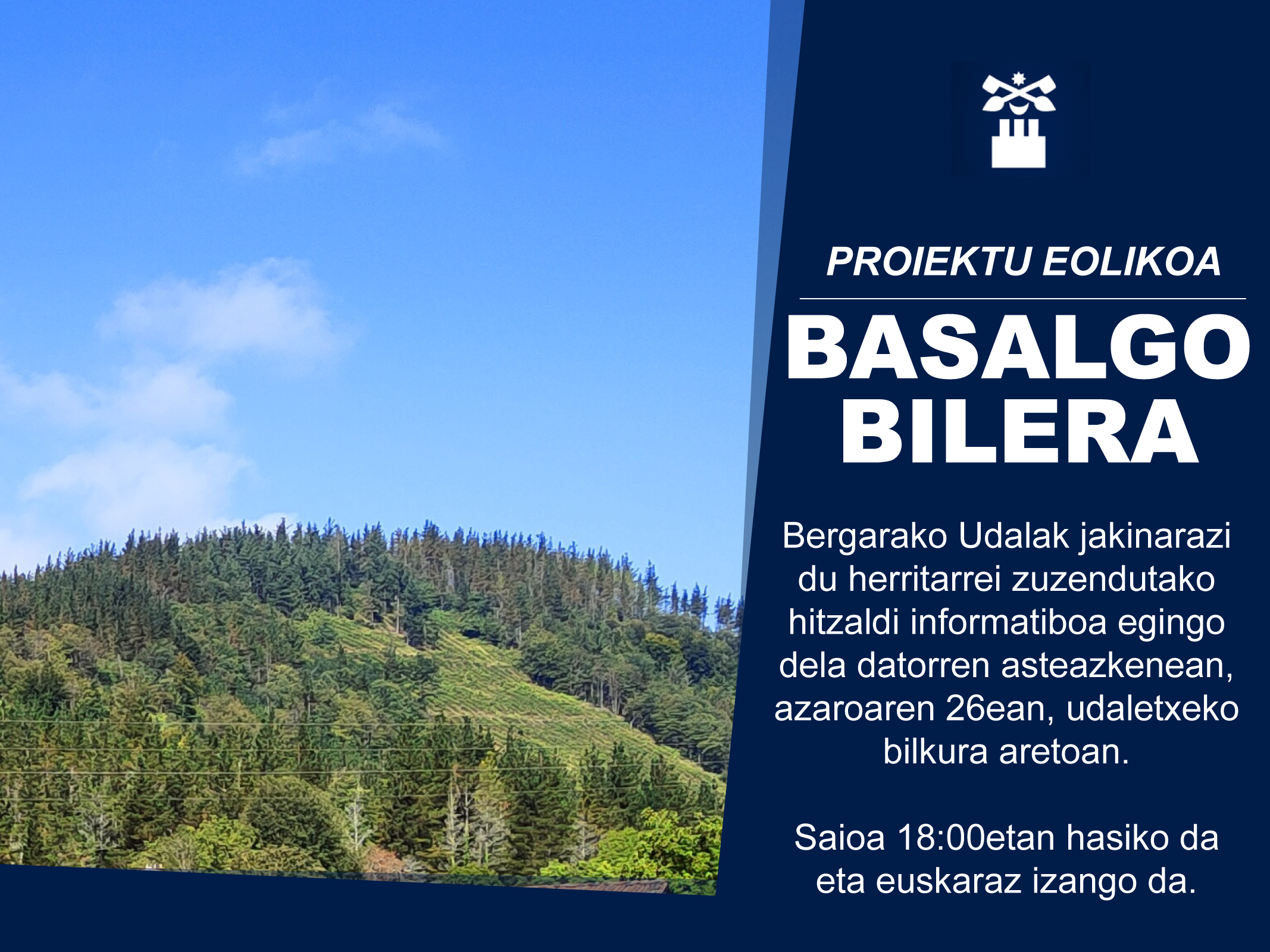 El Ayuntamiento de Bergara ha informado de que el próximo miércoles, 26 de noviembre, se celebrará en el salón de plenos de la Casa Consistorial una charla informativa dirigida a la ciudadanía. La sesión comenzará a las 18:00 horas y será en euskera.