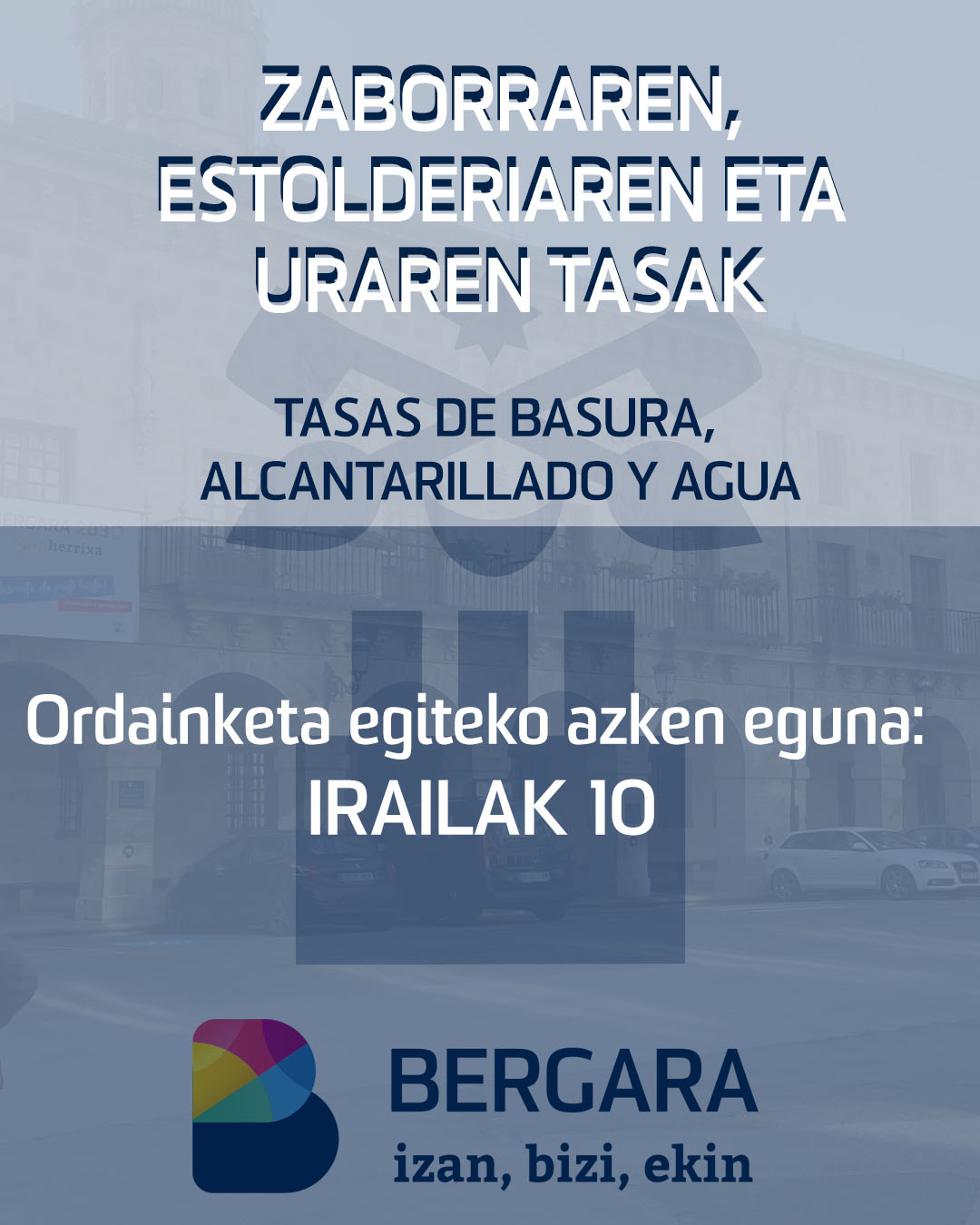 Bergarako udalerriko zergapekoei jakinarazten dizuegu Zaborraren, Estolderiaren eta Uraren tasen 2021 urteko bigarren hiruhileko erreziboak ordaintzeko epea, lekuak eta medioak ondokoak direla: