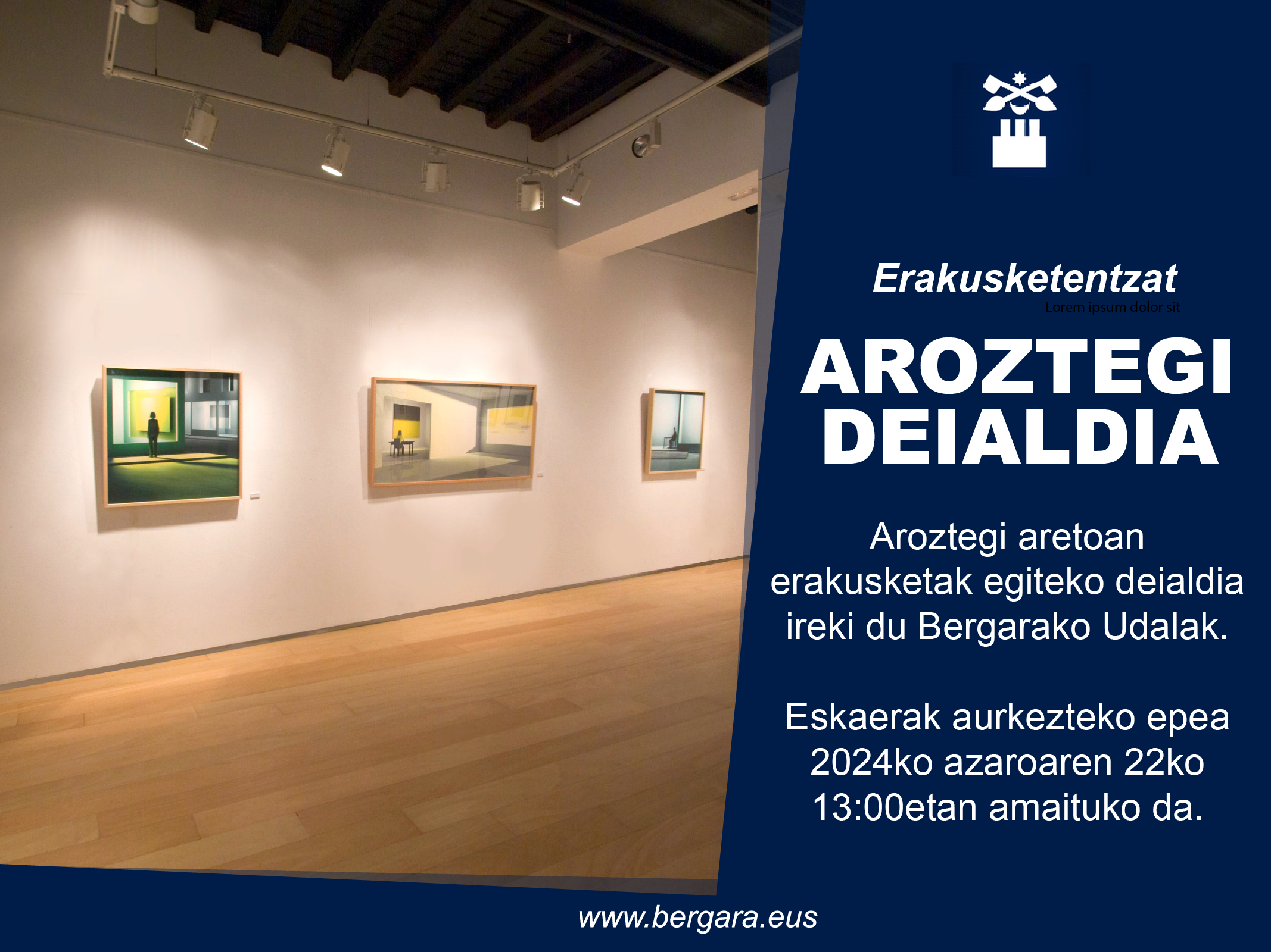 Beren lanak Aroztegi aretoan erakutsi nahi dituzten artistek Bergarako Udal Erregistro Elektronikoaren bidez aurkeztu beharko dituzte eskabideak, edo, bestela, urriaren 1eko 39/2015 Legearen 16.4 artikuluan aurreikusitako beste bitarteko batzuen bidez. Eskaerak aurkezteko epea 2024ko azaroaren 22ko 13:00etan amaituko da.