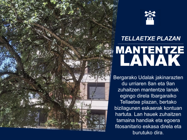 Bergarako Udalak jakinarazten du urriaren 8an eta 9an zuhaitzen mantentze lanak egingo direla Ibargaraiko Tellaetxe plazan, bertako bizilagunen eskaerak kontuan hartuta. Lan hauek zuhaitzen tamaina handiak eta egoera fitosanitario eskasa direla eta burutuko dira.
