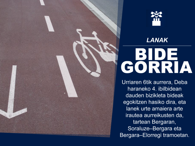 Urriaren 6tik aurrera, Deba haraneko 4. ibilbidean dauden bizikleta bideak egokitzen hasiko dira, eta lanek urte amaiera arte irautea aurreikusten da. Bergarako eremuan honako tarteetan egingo dira jarduerak: