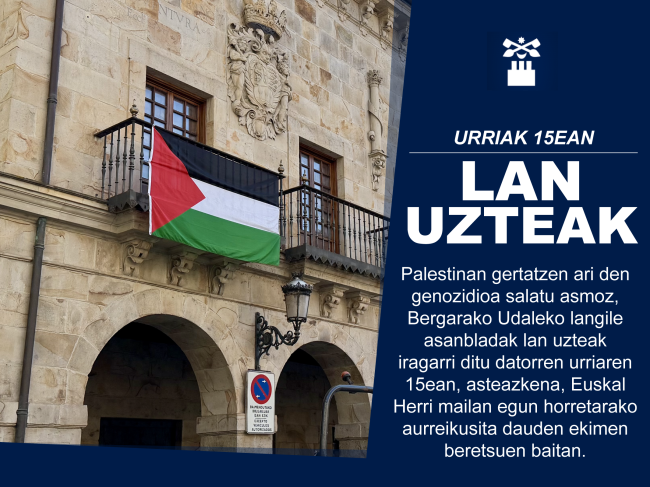 Palestinan gertatzen ari den genozidioa salatu asmoz, Bergarako Udaleko langile asanbladak lan uzteak iragarri ditu datorren urriaren 15ean, asteazkena, Euskal Herri mailan egun horretarako aurreikusita dauden ekimen beretsuen baitan.