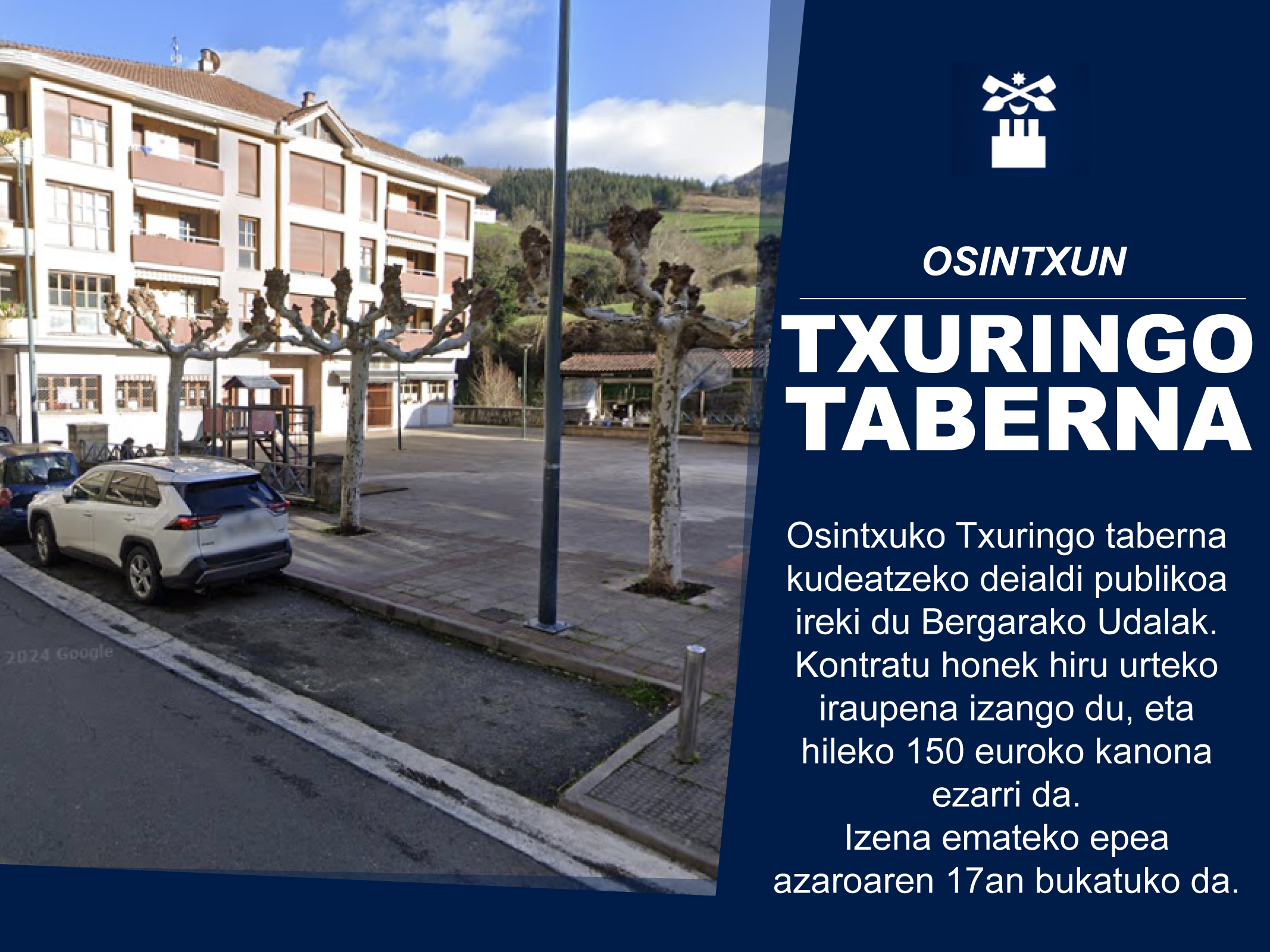 Osintxuko Txuringo taberna kudeatzeko deialdi publikoa ireki du Bergarako Udalak. Kontratu honek hiru urteko iraupena izango du, eta ustiapenaren truke, hileko 150 euroko kanona ezarri da. Hala ere, lizitatzaileek kopuru hori hobetu dezakete beren proposamen ekonomikoan. Adjudikazioa gauzatu ondoren, 1.000 euroko bermea egin beharko da hamar egun balioduneko epean. Izena emateko epea azaroaren 17an bukatuko da.