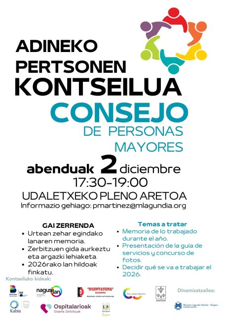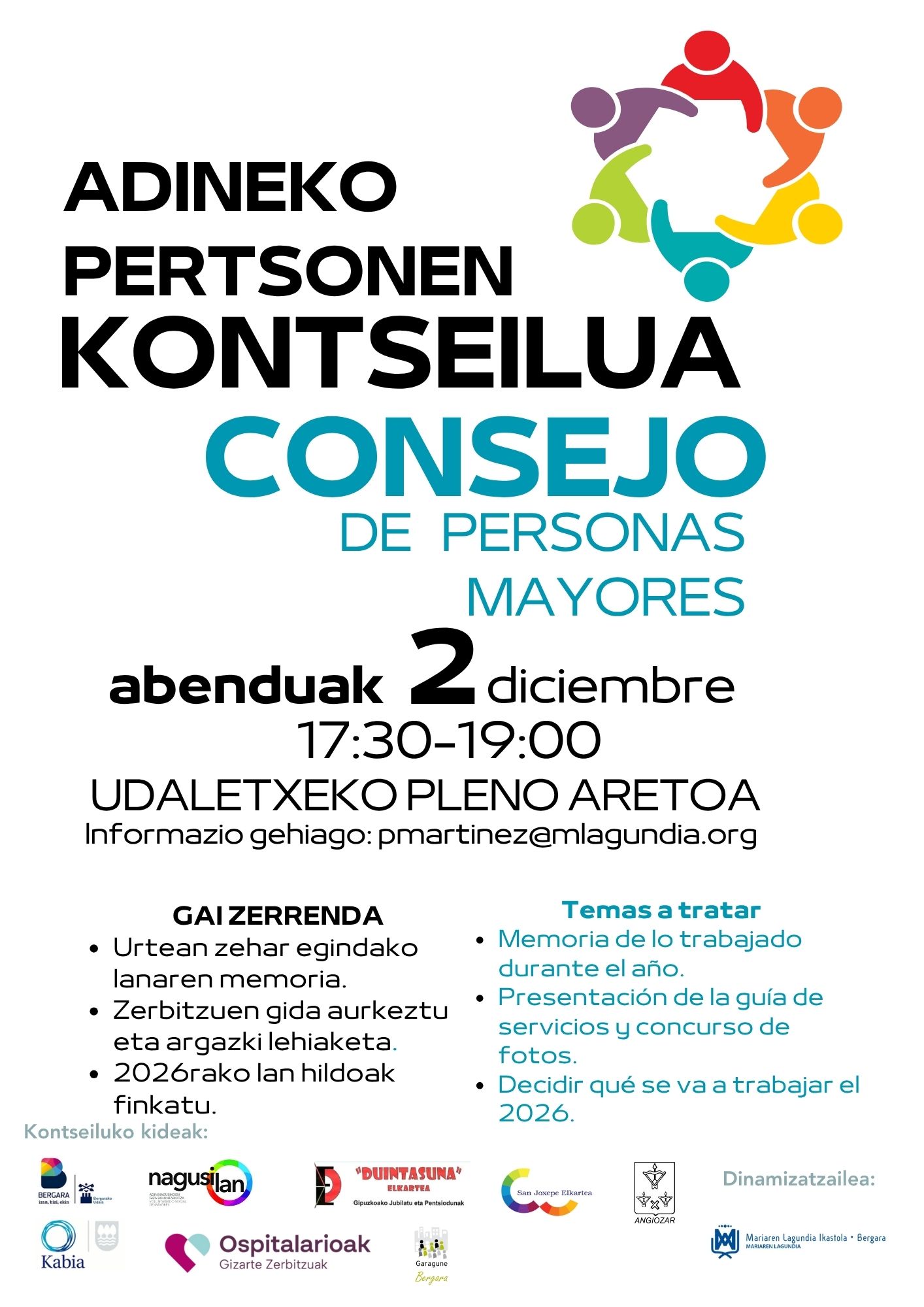 Bergarako Adineko Pertsonen Kontseiluak urteko bilera egingo du abenduaren 2an, 17:30etik 19:00etara, Udaletxeko Pleno Aretoan. Topaketa honek urtean zehar egindako lanaren balorazioa egiteko eta 2026rako lan-ildoak zehazteko aukera eskainiko du.