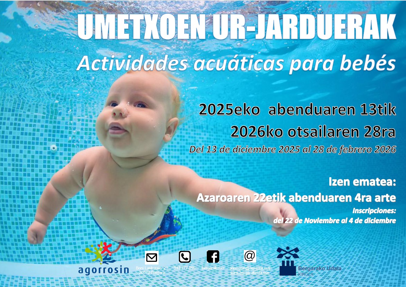 Bergarako Udalak antolatutako umetxoentzako ur jarduerak abian jarriko dira berriro, 2025eko abenduaren 13tik 2026ko otsailaren 28ra bitartean. Jarduera hauek gurasoen laguntzarekin egiten dira, uraren onurak aprobetxatuz haurren garapen motorra sustatzeko eta guraso-haur arteko lotura indartzeko. Helburua da gurasoei ur ingurunean autonomia ematea eta jardueraz gozatzeko aukera eskaintzea, baita haurren garapen motorra bultzatzea ere.