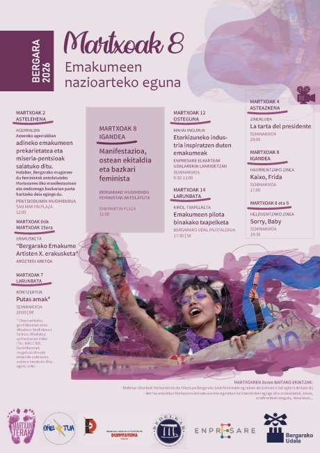Bergarako Udalak eta herriko elkarte zein eragile feministek Martxoaren 8aren bueltan prestatu duten egitarau zabala aurkeztu dute. Helburua da Emakumeen Nazioarteko Eguna ikusgarri egitea eta berdintasunaren aldeko kontzientzia eta parte hartzea sustatzea.