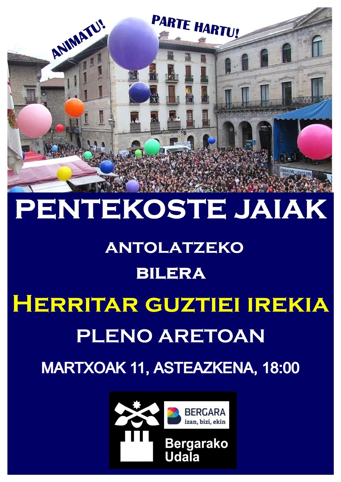 Bergarako Udalak Pentekoste Jaiak antolatzeko lanak abian jarri ditu, eta horren baitan, bergarar guztiei irekita egongo den bilera deitu du datorren martxoaren 11n, asteazkena, arratsaldeko 18:00etan, udaletxeko Pleno Aretoan.