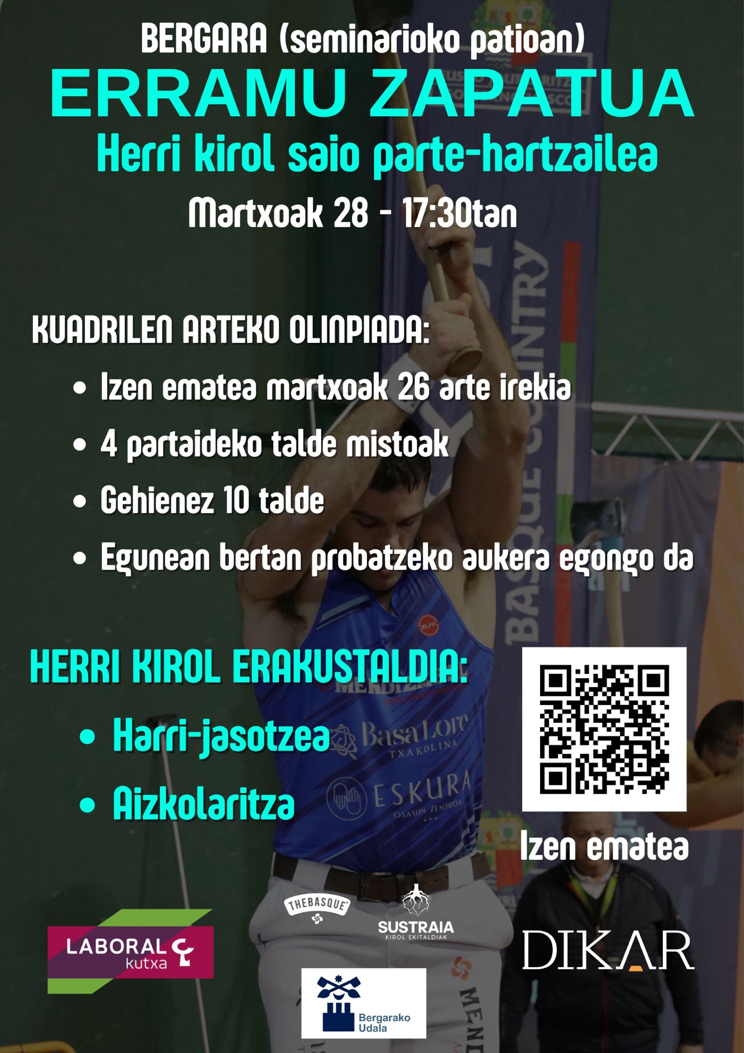 Erramu Zapatua ospatzeko, Bergarako Udalak herri kiroletako jardunaldi partehartzaile berezia antolatu du datorren martxoaren 28an, 17:30ean, Seminarioko patioan, harri-jasotzea eta Aizkolaritza modalitateetan.