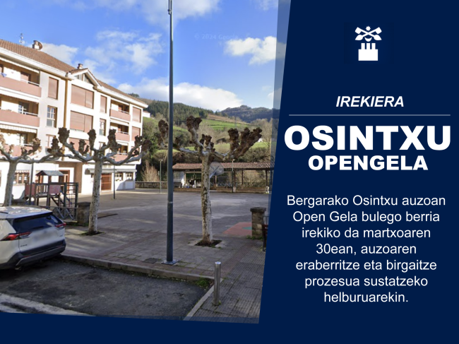 Osintxun Open Gela bulego berria irekiko da apirilaren 1ean, auzoaren eraberritze eta birgaitze prozesua sustatzeko helburuarekin. Ekimen hau Osintxu Biziberritzen mahaiaren lanaren ondorio da (Bergarako Udala, Suradesa agentzia, Txuringo auzo elkartea eta Soraluce Coop).